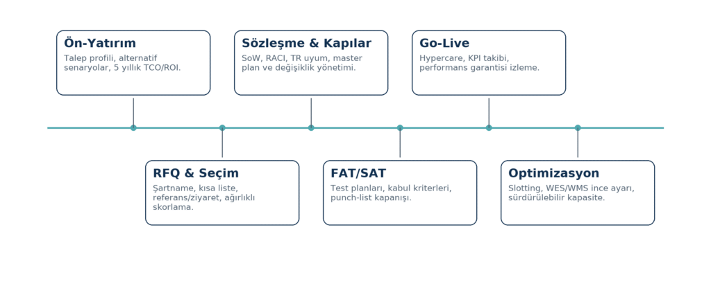 Fizibilite → RFQ & seçim → Sözleşme & tasarım → FAT/SAT → Go-live → Optimizasyon.